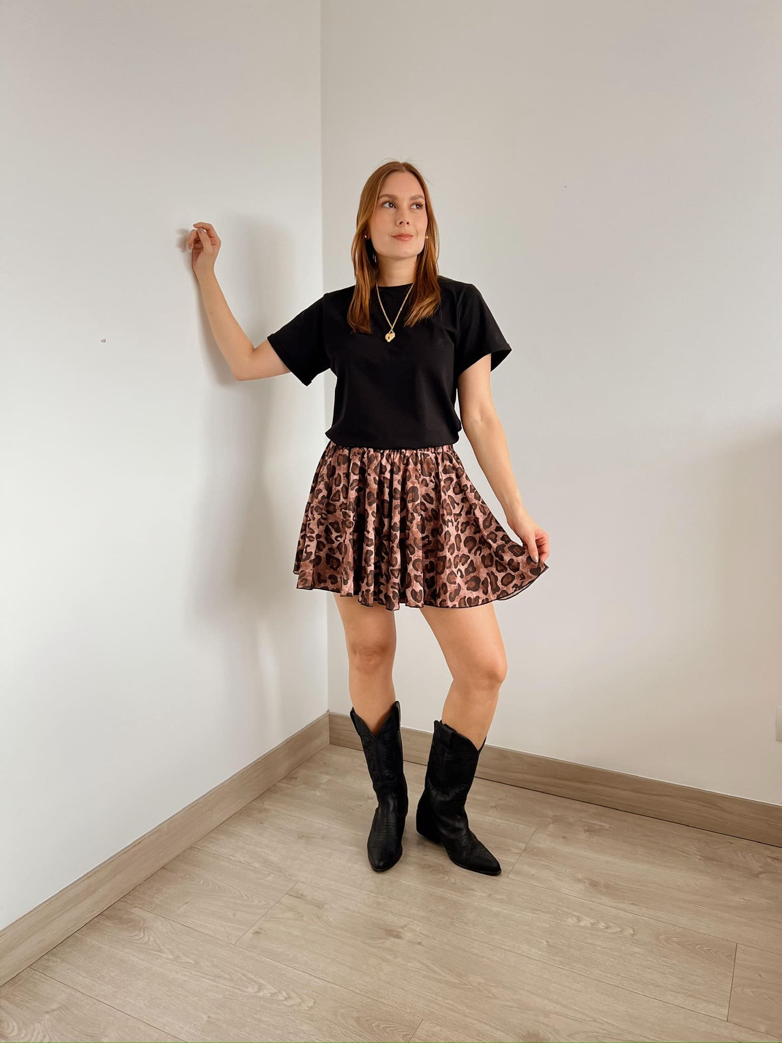 Falda de animal print color café, trae resorte en la pretina, su horma es fresca y ligera. Ideal para nuestro día a día. Es tiro alto, no requiere planchada.