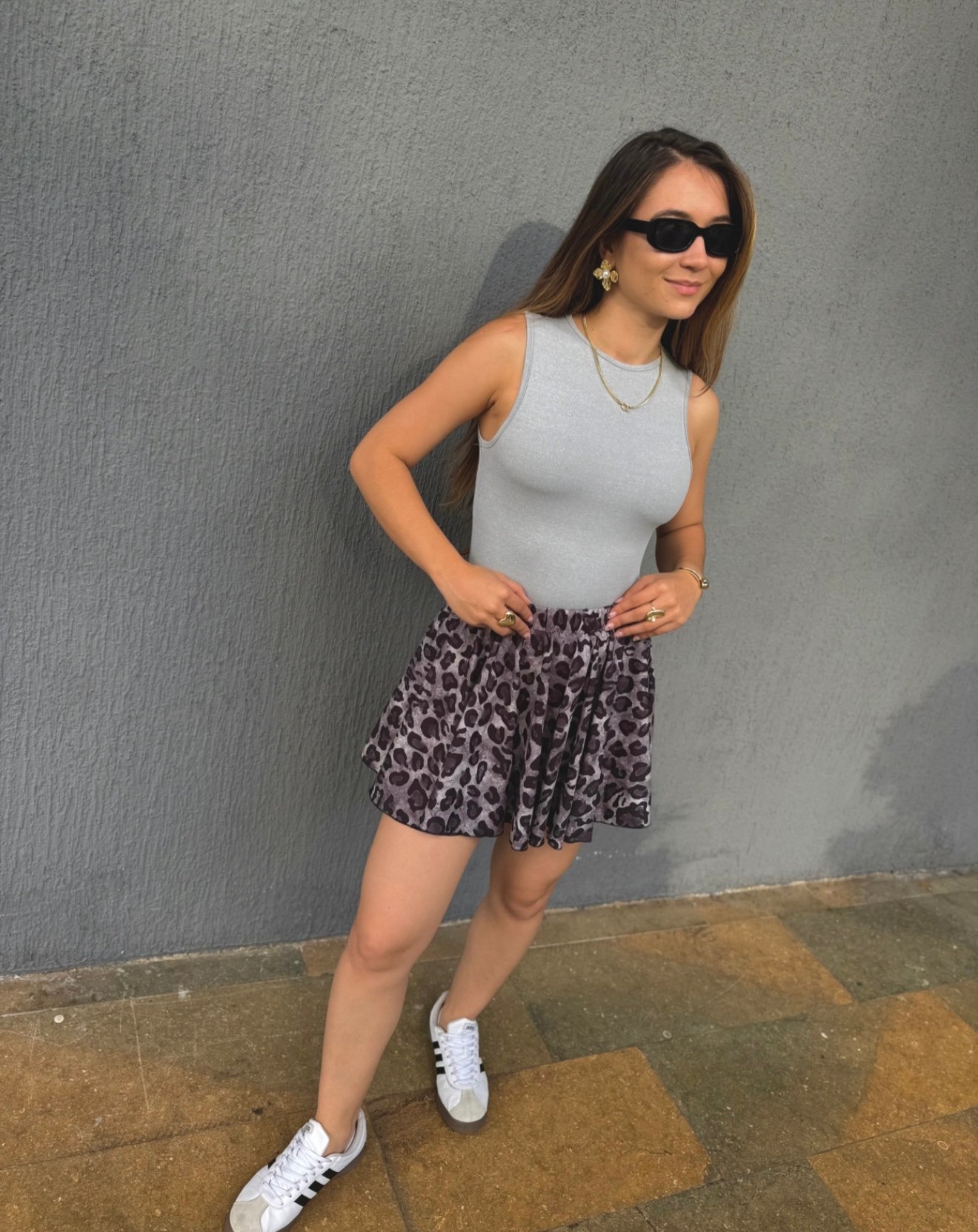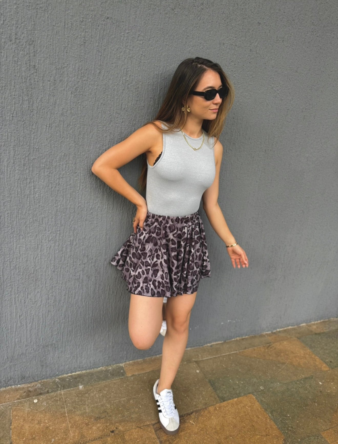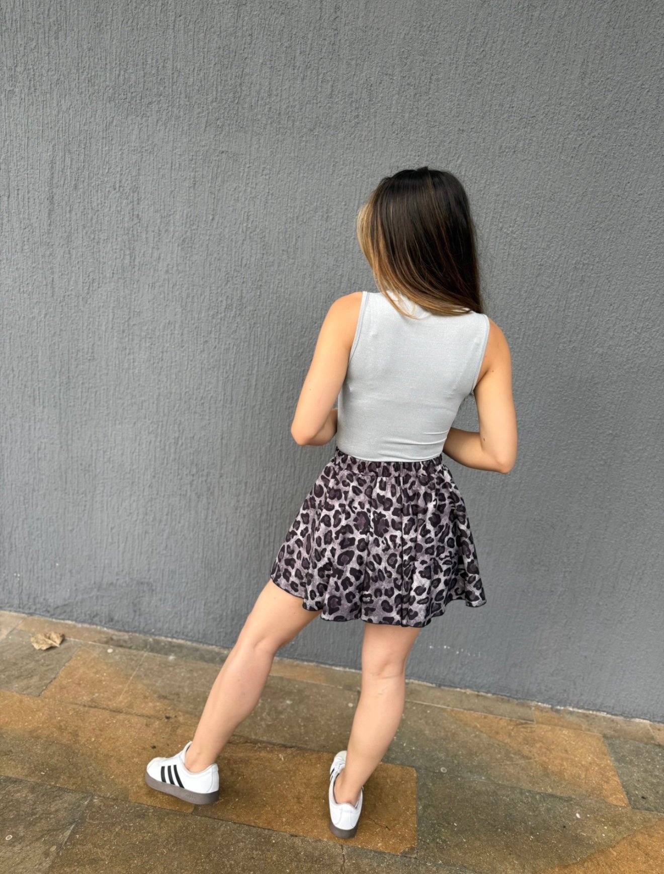 Falda de animal print color gris, trae resorte en la pretina, su horma es fresca y ligera. Ideal para nuestro día a día. Es tiro alto, no requiere planchada.
